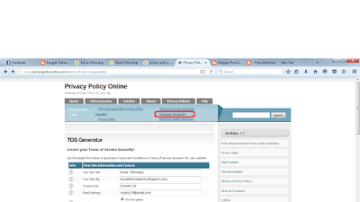 1.Ketika anda sudah membuat privacy policy anda klik di bagian header terms of service pada web privacy policy seperti gambar di bawah ini anda harus memasukan site ,link dan email anda Jika sudah kemudian anda pilih Generate Html yang udah ane kasih tanda merah.